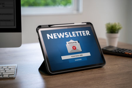 Email marketing and media, communication with newsletter concept background. Mobile phone with signup newsletter page and satisfied customers hand in thumb up gesture indoors