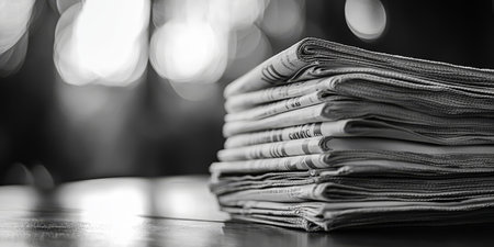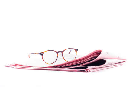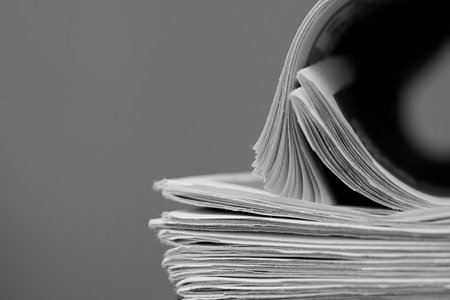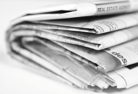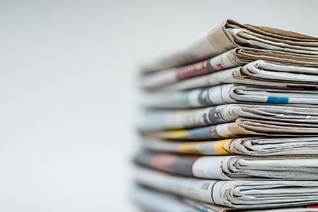 Close up of stacked newspapers on white background with ample copy space for your design needs