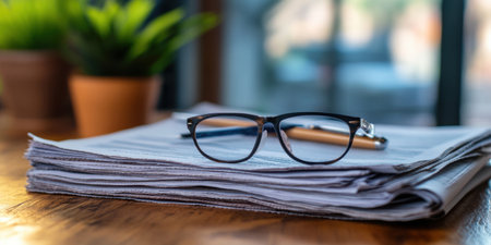 Coffee and glasses beside a newspaper d what's new on a modern desk with a keyboard