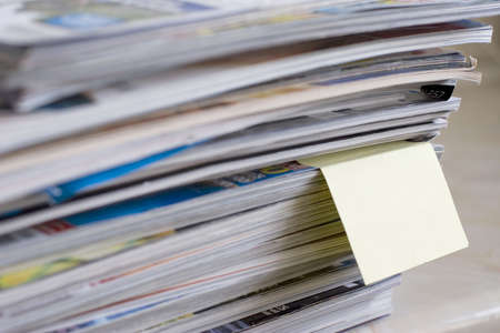 A pile of magazines with a blank sticky reminder note poking out