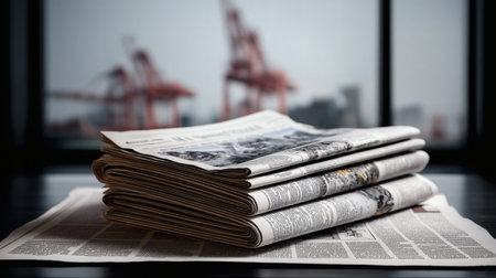 A neatly stacked pile of newspapers sits on a reflective table with a port or industrial skyline in the background capturing the essence of journalism, daily updates, and global awareness.