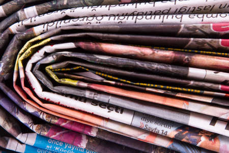 Newspapers folded and stacked on the table background. Colorful newspaper. Image shallow depth of field.