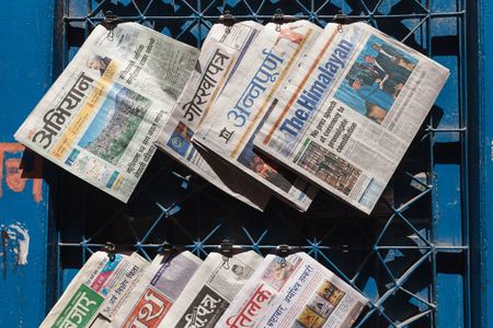 KATHMANDU, NEPAL - SEPT 18, 2015 : The Nepalese newspapers displayed outside a newsagent shop on September 18, 2015.