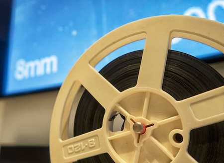 Old coil with 8 mm of film on vintage dark background of cinema strips, photographic films, retro style. Photo, movie, cinema concept
