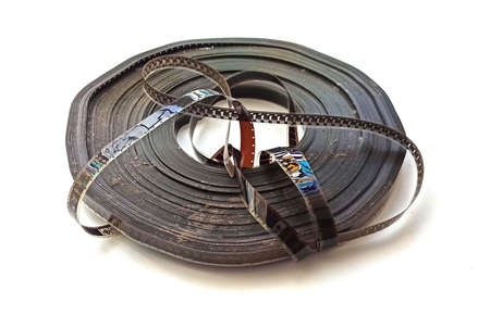 A reel of motion picture film on a white background. Old film strip isolated on white background.