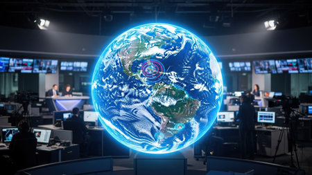 High-tech newsroom displaying global map and cityscape, ready for broadcasting breaking news