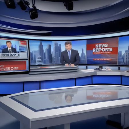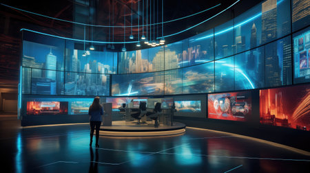 Modern virtual news studio set featuring multiple screens, advanced technology, and a sleek design, perfect for broadcasting global events