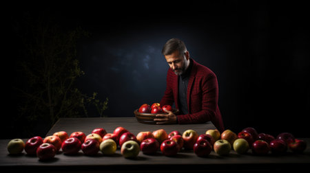 Man choosing between red and yellow apples on wooden table against dark background.