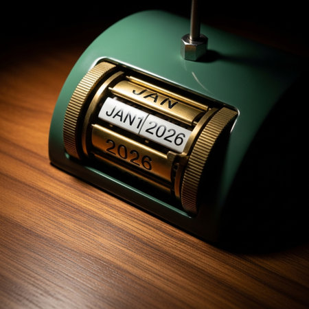 Vertical composition (9:16) showing a minimalist wooden desk calendar on a pale desk surface, isolat