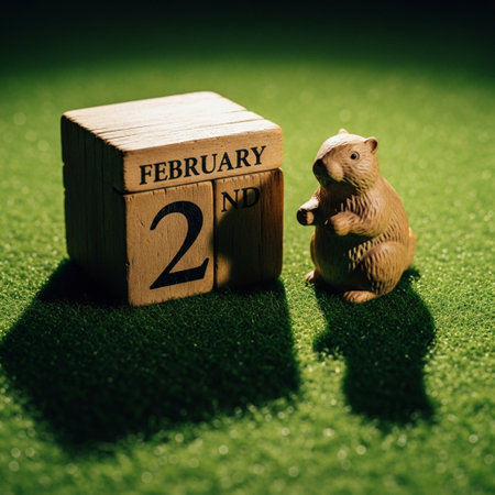 Wooden cube calendar with date February 22 and hamster on green grass background
