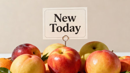 Vibrant still life featuring fresh produce like smooth-skinned nectarines and crisp apples, backlit by sun, advertising a daily special with a prominent text card.