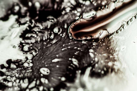 Bubble fluid. Oil liquid texture. Defocused dark black white paint in water round shiny drop spreading on abstract art background.