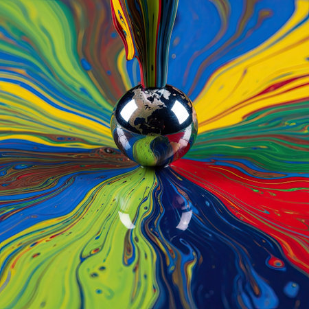 An overhead view displays a chrome sphere surrounded by streams of vibrant paint. Various colors, including red, yellow, blue, and green, radiate outwards. The composition suggests a studio setting with creative lighting and is suitable for designs, illustrations, and other commercial uses.