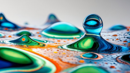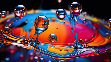 showing macro view of colorful oil and water droplets interacting within a clear liquid medium creating abstract shapes and patterns with...