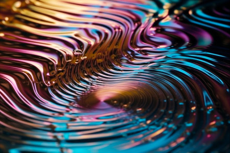 Abstract showing close-up of iridescent liquid surface with swirling rainbow colors and undulating wave-like...