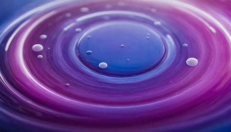This abstract macro showcases the effect of swirling purple and blue liquid. Concentric ripples create a sense of motion, with small, glossy white bubbles scattered across the surface. The interplay of colors and the fluid dynamics create a visually dynamic and abstract composition.