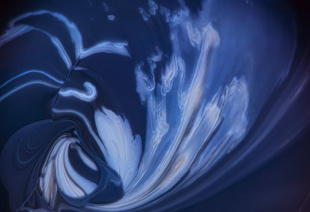 This image features a macro shot of fluid art with a mesmerizing blend of blue and black. The composition showcases swirling patterns and various sized circular forms. The textures and color gradients create visual interest. This artwork is suitable for use in design projects or as a background.