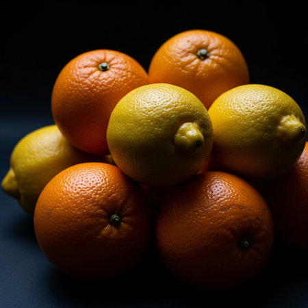 An editorial-style, highly contrasted still life photograph showcasing a collection of fresh, ripe o