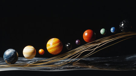 A vibrant model of the solar system showcasing various planets, creatively arranged with a striking black background, perfect for educational or artistic use.