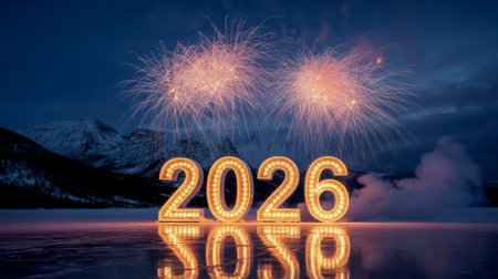 Glowing 2026 date with fireworks exploding in the background over a reflective surface at night