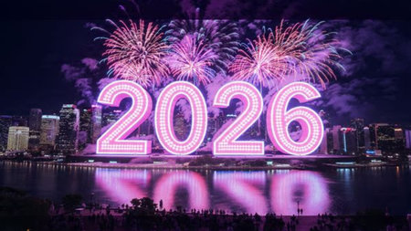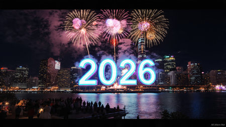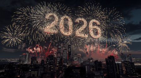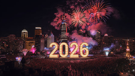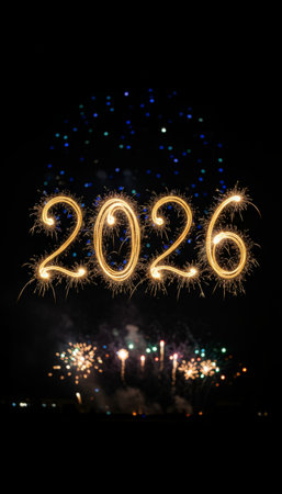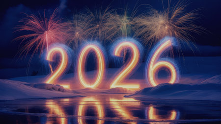 The year 2026 is creatively depicted with sparkling fireworks, surrounded by a vibrant display of lights, capturing the essence of celebration and anticipation for the New Year