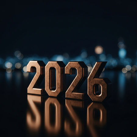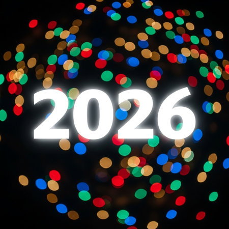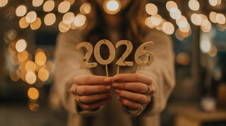 A person holds up the numbers 2026 against a backdrop of bokeh lights, symbolizing the upcoming New Year.