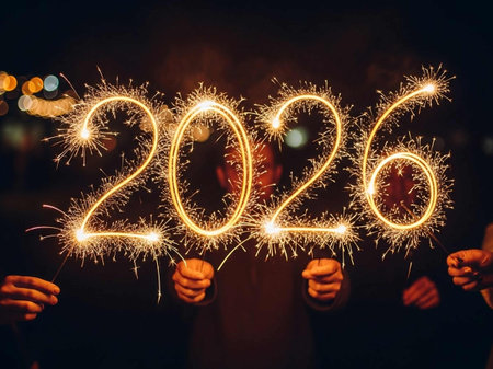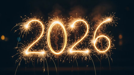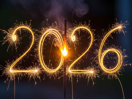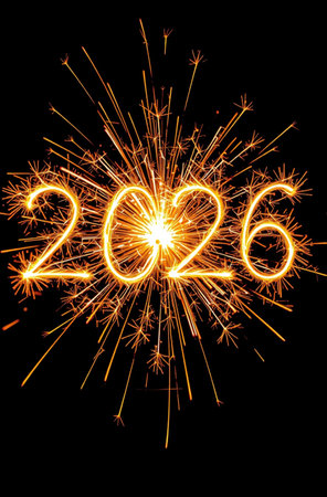 The year 2026 is written in bright, fiery sparklers against a black background.