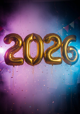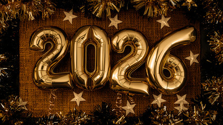 A festive arrangement for the New Year 2026, featuring shiny balloons spelling out the year, surrounded by glittering ornaments and warm, twinkling lights.
