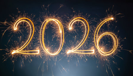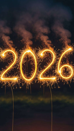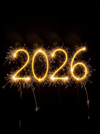 An artistic representation of the year 2026 created with sparklers against a dark backdrop, ideal for capturing the essence of new year festivities and celebrations.