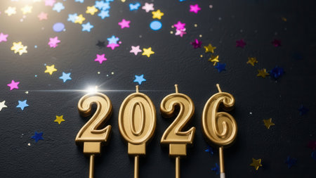 The year 2026 spelled out with golden candles on a dark background. Festive colorful star and circle confetti are scattered around with a bright lens flare.