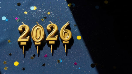 Golden number candles forming the year 2026 on a dark blue surface with colorful confetti and a dramatic shadow. A festive concept for a New Year celebration.