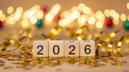 Wooden blocks spell out the year 2026 amidst a festive scene of golden confetti and ribbons with a warm blurry light background perfect for New Years Eve.