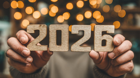 Close-up of hands holding wooden numbers spelling out 2026, with a soft bokeh background of warm lights.
