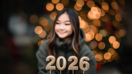 A young Asian girl with a warm smile is featured against a backdrop of blurred, festive bokeh lights. The year 2026 is prominently displayed, suggesting a New Year or future-oriented theme.