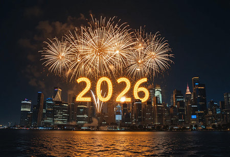 Spectacular golden fireworks illuminate the night sky above a city skyline, marking the year 2026.