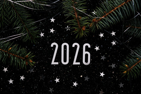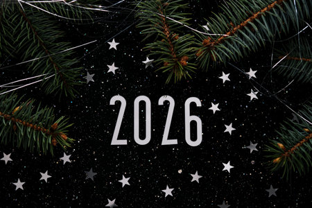 New Year 2026 dark background. Number of the coming year in Christmas decoration.