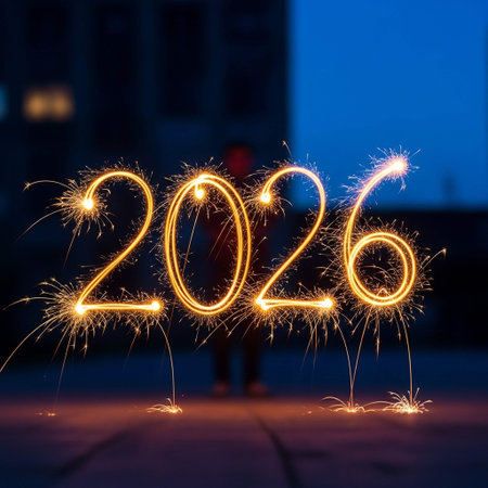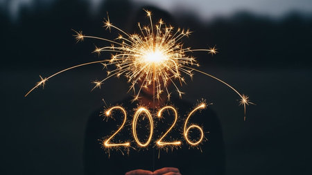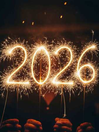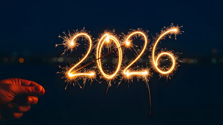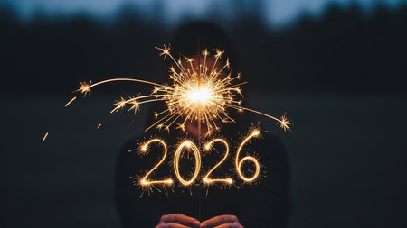 Sparkling 2026 sparklers in hand on festive bokeh background.