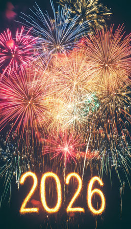2026 New Year Fireworks Celebration, A vibrant display of colorful fireworks illuminating a dark night sky, with the year 2026 prominently displayed in sparkling.