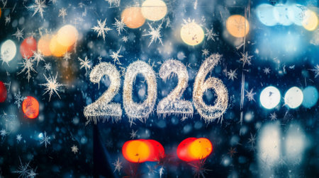 New Year 2026 frosty glass with snowflakes and bokeh lights background, AI generated