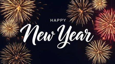 Happy New Year Party Fireworks background - Abstract colorful firework with yellow bokeh lights in the dark black night, New Year's Eve