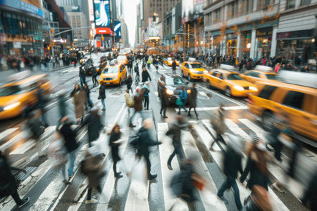 Overhead shot of a bustling city crosswalk with yellow taxis and pedestrians, capturing the vibrant urban life during rush hour. Resplendent.