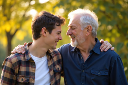 A joyful moment shared between a father and son outdoors, surrounded by nature.