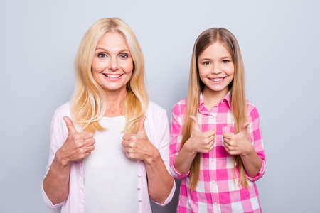 Portrait of two nice cute charming attractive lovely sweet cheerful people wearing casual checkered shirt granny showing thumbup isolated over gray pastel background.