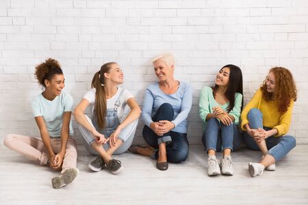 Multiethnic Women Of Diverse Age Smiling At Each Other Relaxing Sitting On Floor Against White Wall Indoor. Selective Focus