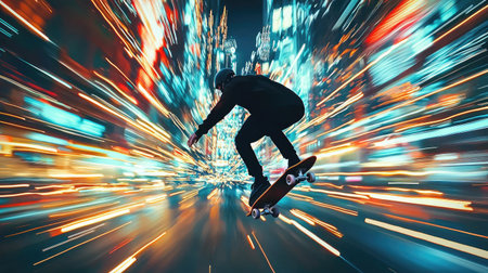 This vibrant image captures a skater performing tricks in an energetic urban landscape, surrounded by colorful motion blur lights, highlighting speed and adventure.