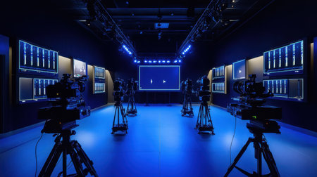 A cutting-edge studio featuring numerous professional cameras set against blue lighting, designed for video production and photography in a sleek, modern environment.