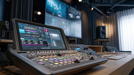 A detailed view of a modern audio control room featuring a colorful mixing console and a large display screen, ideal for sound engineering and live performance.