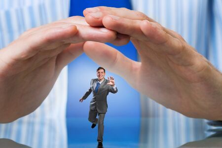 Boss defending his team with a gesture of protection. Life insurance. Customer care, care for employees. A responsibility. Social protection. Security and safety in a business team. Human resources.