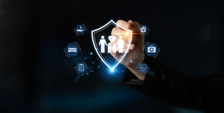 Hand holding glowing shield with family icon surrounded by insurance symbols representing family protection by health insurance, life insurance and financial security concept.