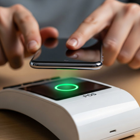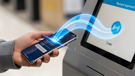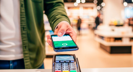 A customer is engaged in a mobile payment transaction at a bustling retail counter, holding a smartphone close to a payment terminal. Generative AI